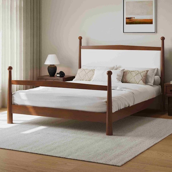 Brown Wood Frame Queen Size Platform Bed with Upholstered Headboard in Boucle