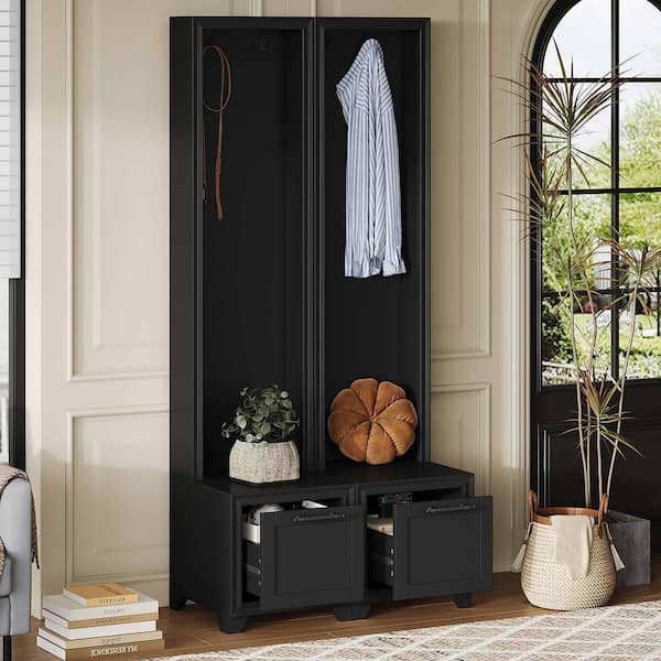 Elegant Free Standing Hall Tree Set of 2, Entryway Coat Rack with Black Retro Handles, Storage Drawers, Black