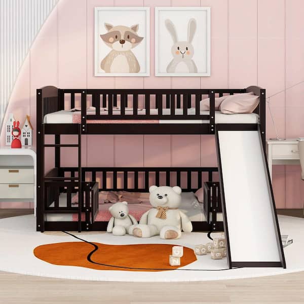Espresso Full Over Full Low Bunk Bed with Fence, Slide, Ladder for Toddler Kids Teens