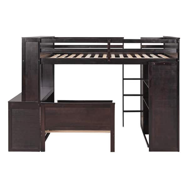 Espresso Full Size Loft Bed with a Twin Size Stand-Alone Bed, Shelves, Desk and Wardrobe