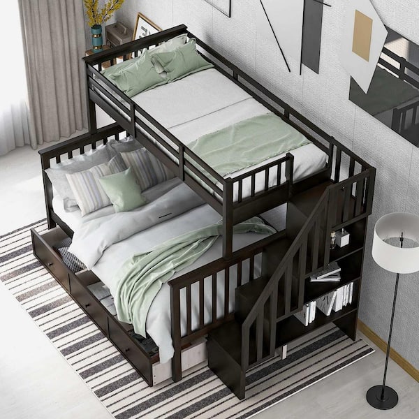 Espresso Stairway Twin-Over-Full Bunk Bed with Drawer, Storage and Guard Rail for Bedroom, Dorm, for Adults