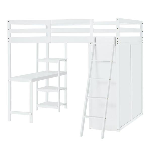 Full Size Loft Bed with Wardrobe and Desk and Shelves, White