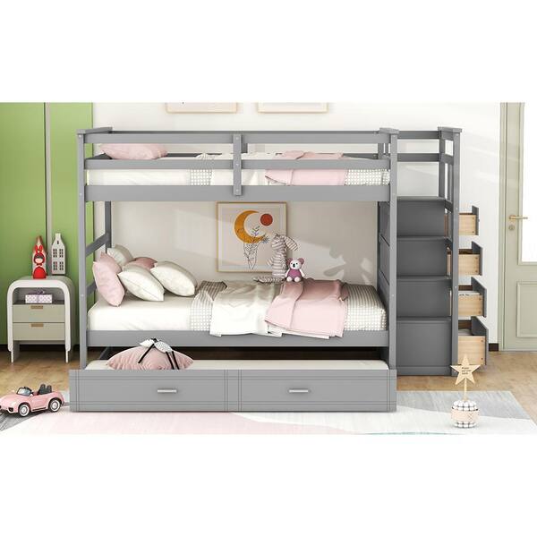 Gray Full Over Full Bunk Bed with Twin Size Trundle and Staircase