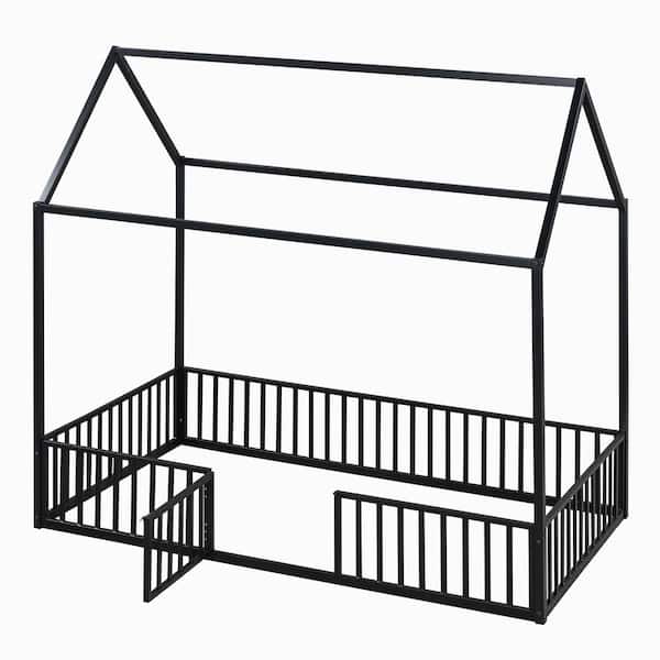 Gray Metal Frame Twin Platform Bed with Fence and Door