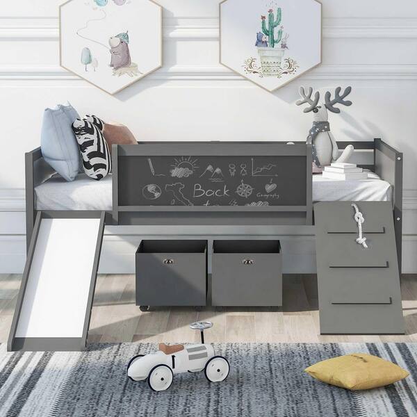 Gray Twin Size Wood Loft Bed with 2-Storage Boxes