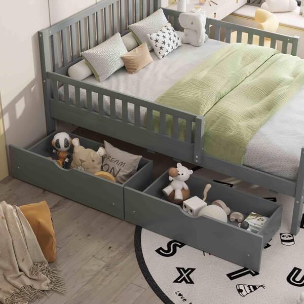 Gray Wood Frame Full Size Platform Bed with Guardrails on Both Sides and Two Storage Drawers