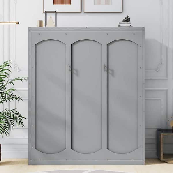 Gray Wood Frame Queen Murphy Bed with Shelves
