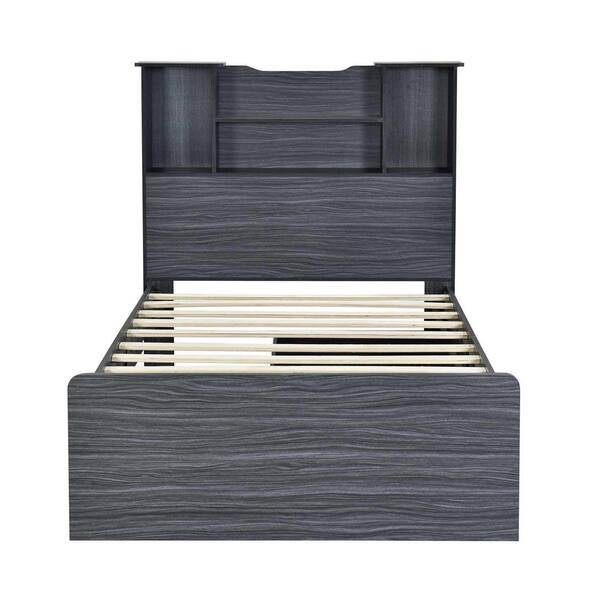 Gray Wood Frame Twin Size Platform Bed with 4-Open Storage Shelves and 2-Storage Drawers, LED Light