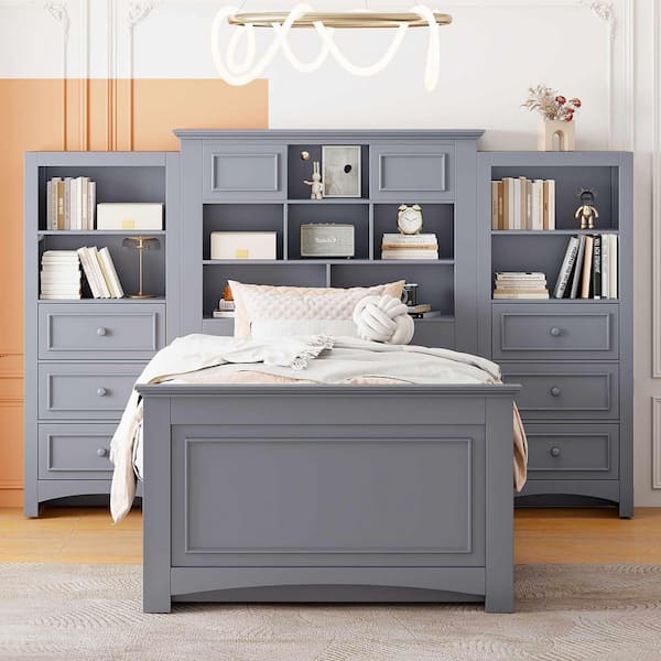 Gray Wood Frame Twin Size Platform Bed with Vertical All-in-One Cabinet and 4 Drawers