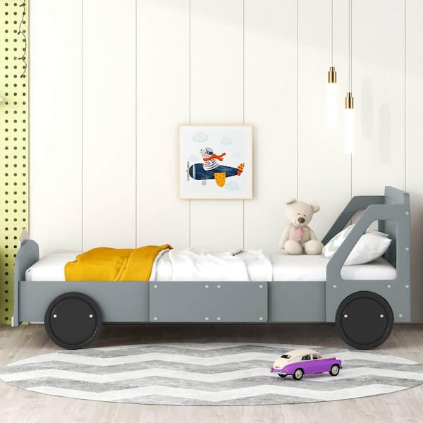 Gray Wood Frame Twin Size Platform Bed with Wheels
