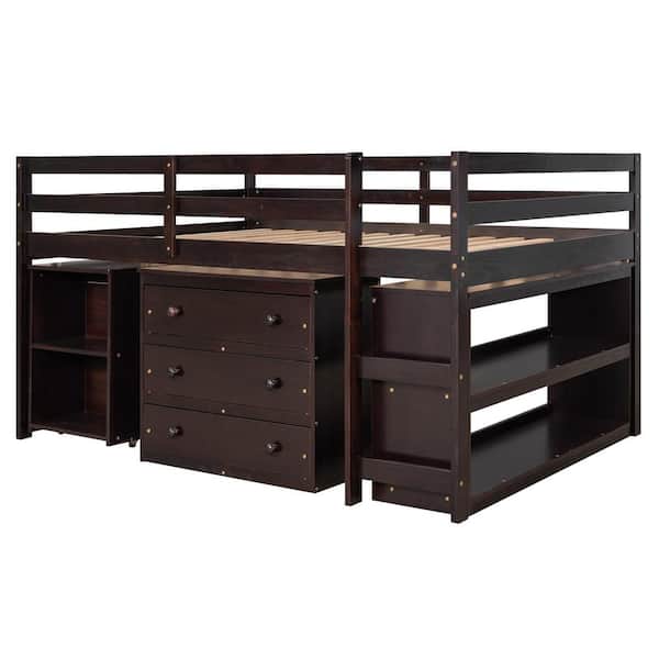 Low Study Full Loft Bed with Cabinet, Shelves and Rolling Portable Desk, Multiple Functions Bed-Espresso