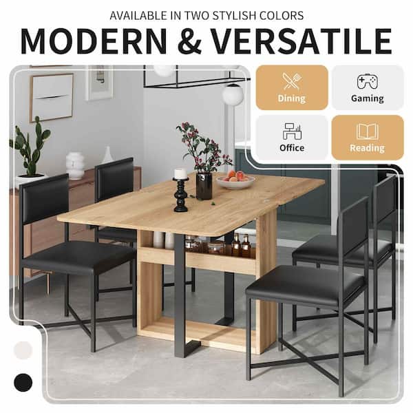 Modern 5-Piece Extendable Square Wood Top Dining Table Set with Storage Rack and 4-Dining Chairs, Black/Natural