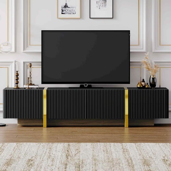 Modern Black TV Stand Fits TV's Up to 80 in. with Storage Cabinets & Drawers, Golden Wood Grain Legs