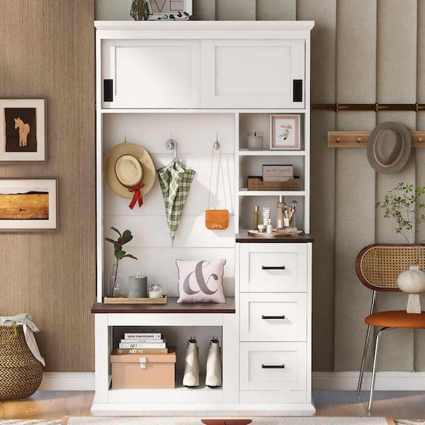 Modern Entryway Bench with Coat Rack, 3 Shelves and Drawers, 3 Sturdy Hooks, Storage Bench for Hallway, Entryway, White