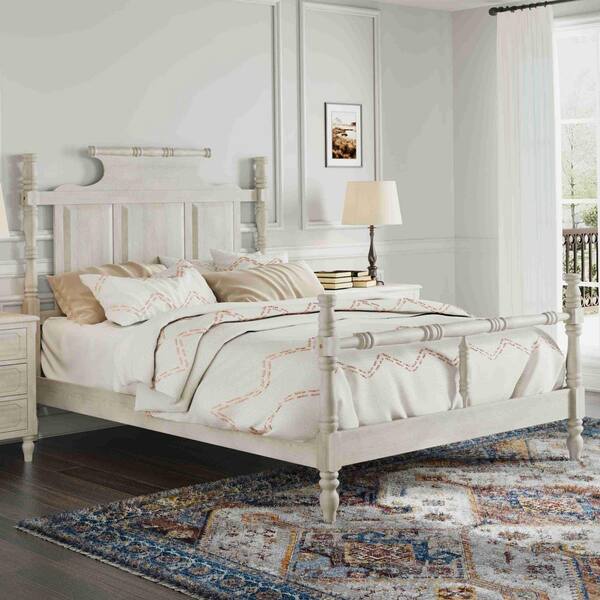 Retro White Wood Frame King Size Platform Bed with 56.9 in. High Crown-like Headboard