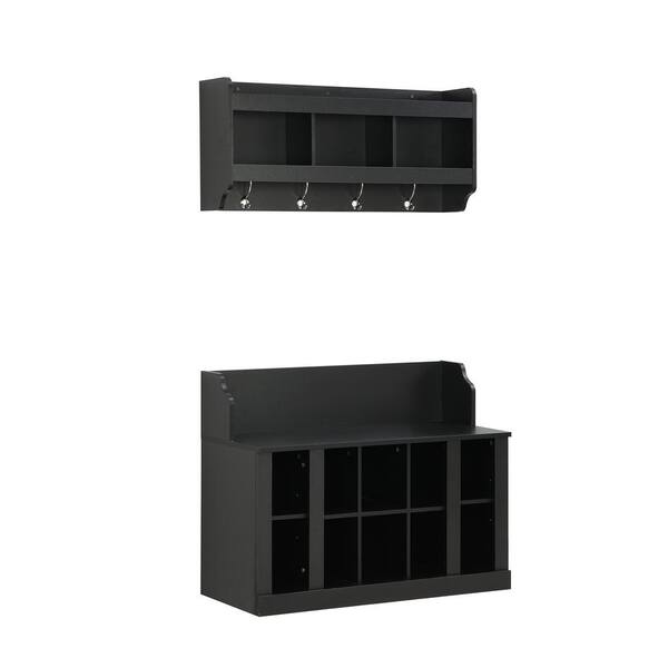 Shoe Storage Bench with Shelves and 4 Hooks, Elegant Hall Tree with Wall Mounted Coat Rack, Entryway Organizer, Black
