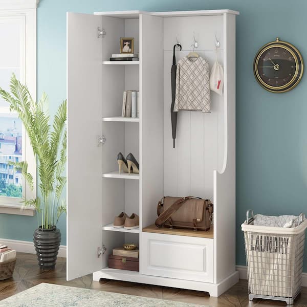 Stylish Design Hall Tree with Flip-Up Bench, Adjustable Shelves, Hanging Hooks for Entryways, Mudroom, White