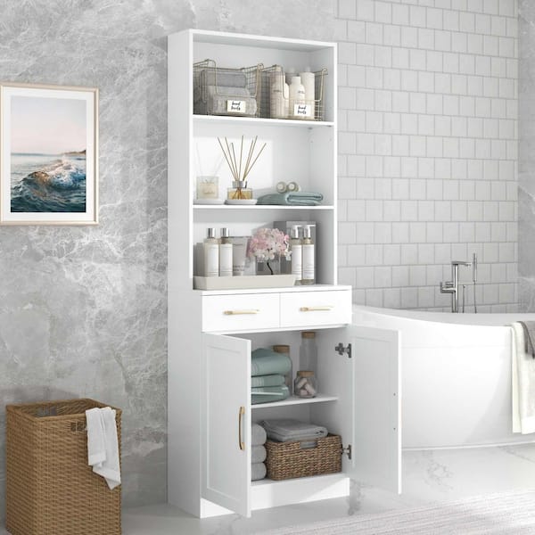 White 70 in. H Accent Cabinet, Bathroom Storage Cabinet with 2-Doors and Drawers, Adjustable Shelf, 3-layer Open Shelf