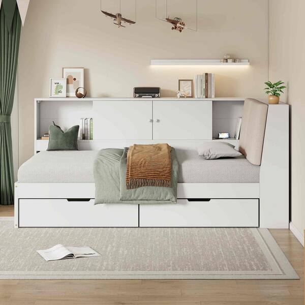 White Full Size Daybed with Storage Bookcase and Upholstered Headboard and USB Charging Ports