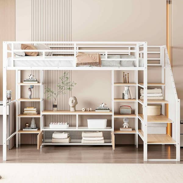 White Full Size Loft Bed with Staircase, Low Storage Table and Storage Shelves