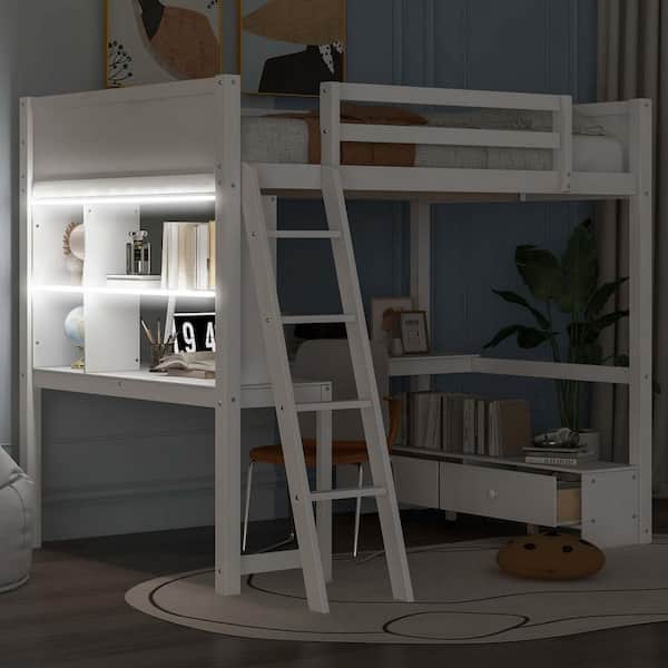 White Full Size Wood Loft Bed with L-shaped Desk, LED light and USB Charging Station, Storage Bench with 2-Drawers