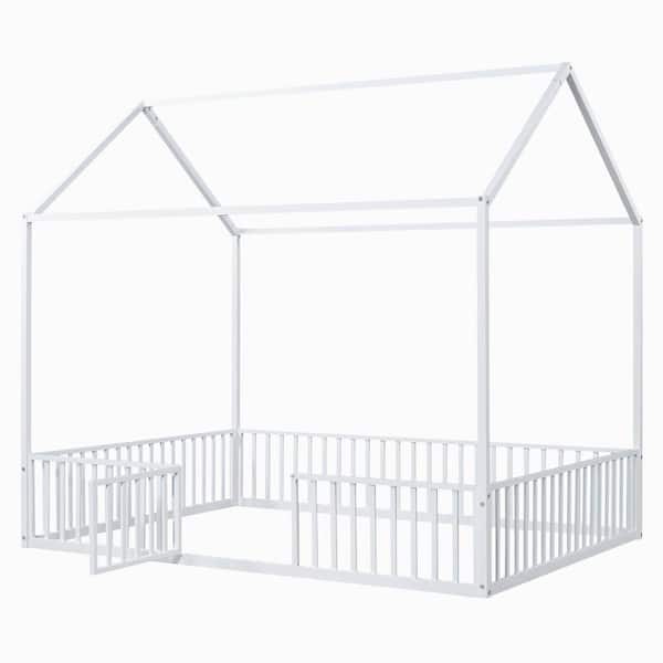 White Metal Frame Full Platform Bed with Fence and Door