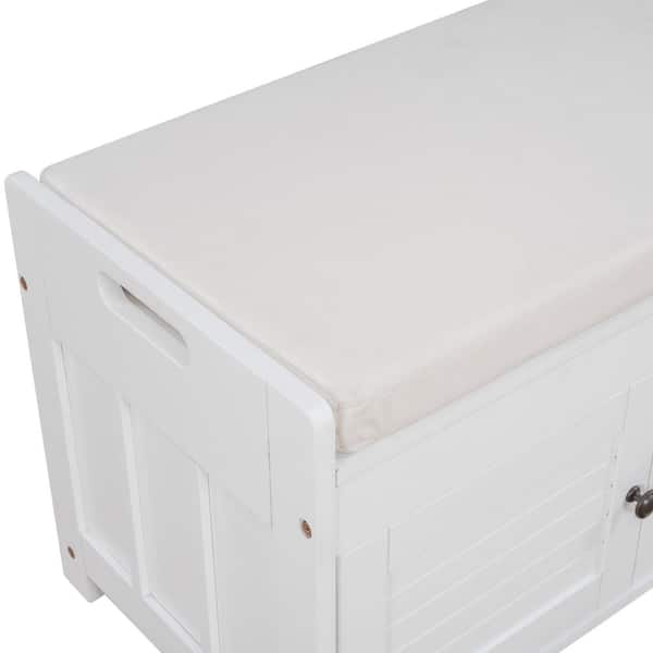 White Storage Bench with Removable Cushion and 3 Shutter-shaped Doors