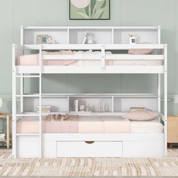 White Twin Size Bunk Bed with Built-in Shelves Beside both Upper and Down Bed and Storage Drawer