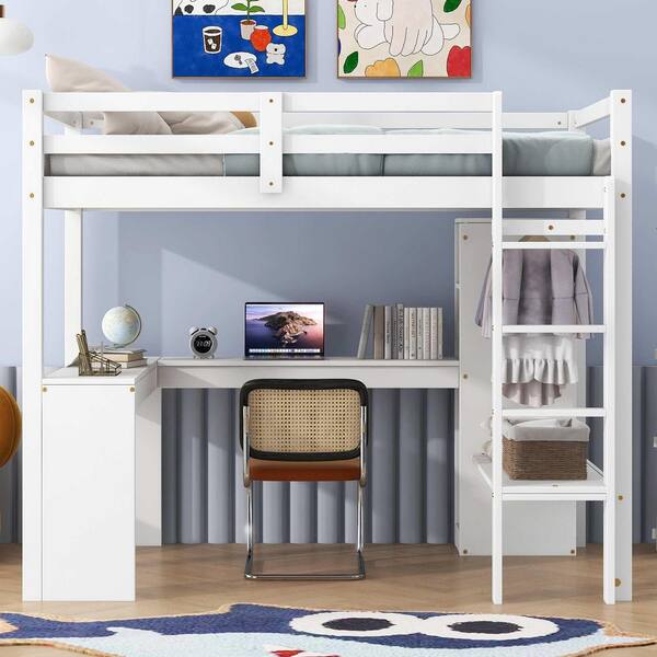White Twin Size Wood Loft Bed with L-shaped Desk, Wardrobe and Storage Shelves