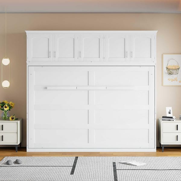 White Wood Frame Queen Murphy Bed with Top Cabinets