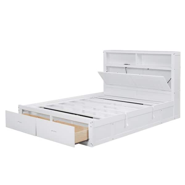 White Wood Frame Queen Size Platform Bed with Storage LED Headboard,Charging Station and 2 Drawers