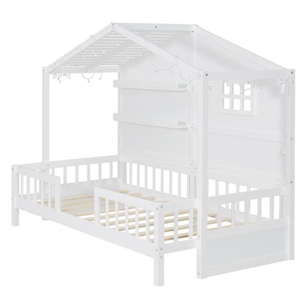 White Wood Frame Twin Size Platform Bed with Shelves,Window and Sparkling Light Strip