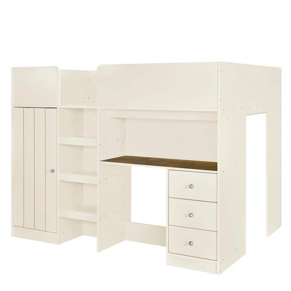 Wood Full Size Loft Bed with Built-in Wardrobe, Desk, Storage Shelves and Drawers, Beige