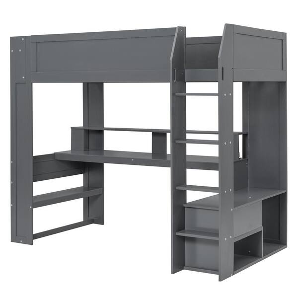 Wood Twin Size Gaming Loft Bed with Desk, Multi-storage Shelves, LED and Charging Station, Dark Gray