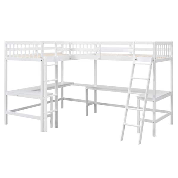 Wood Twin Size L-Shaped Loft Bed with Ladder and 2 Built-in L-Shaped Desks, White