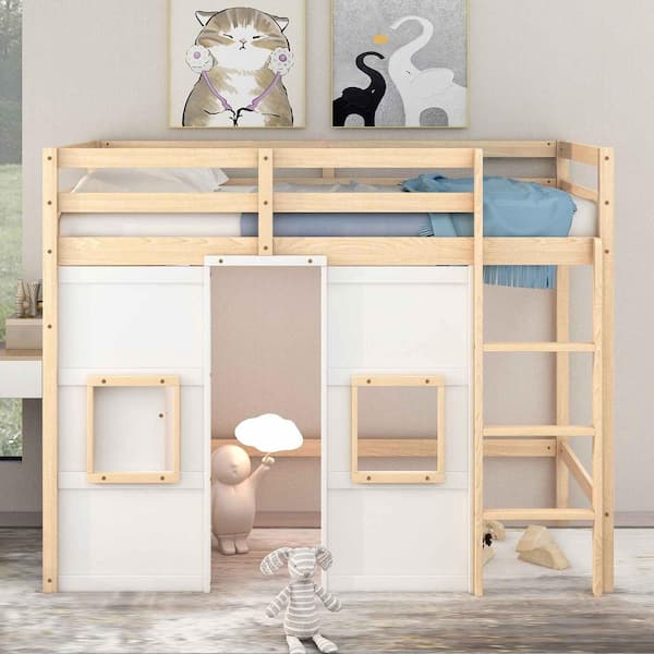 Wood Twin Size Loft Bed with Built-in Storage Wardrobe and 2 Windows, Natural/White