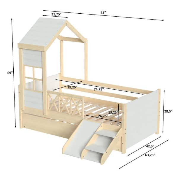 Cozy Natural and White Twin Daybed with Roof, Trundle and Mini Slide
