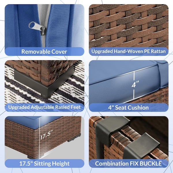 10-Piece Wicker Patio Sectional Conversation Sets With 2 Coffee Table and Navy Cushions
