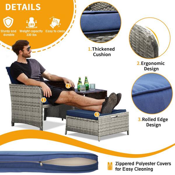 3 of Piece Gray Wicker/Rattan Patio Conversation Sets with Navy Cushion