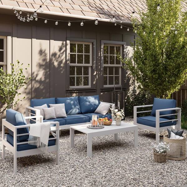 4-Piece Aluminium 5-Seat Outdoor Patio Conversation Set with Blue Cushions