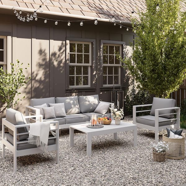 4-Piece Aluminium 5-Seat Outdoor Patio Conversation Set with Light Gray Cushions