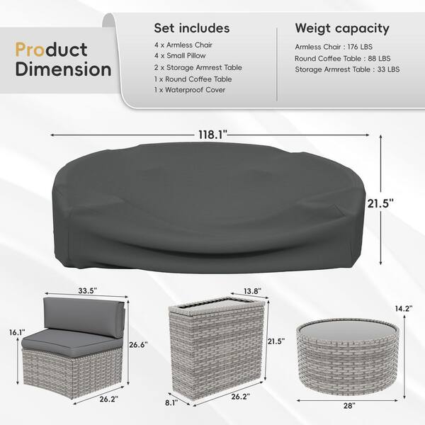 7 Piece Wicker Patio Furniture Sectional Half-Moon Curved Outdoor Sofa Set with Round Coffee Table with Gray Cushions