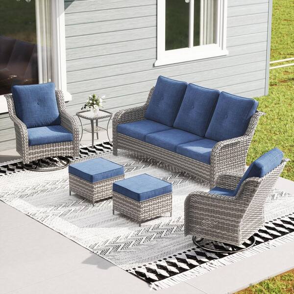 Light Gray (PE) Rattan Metal Frame 6-Piece Outdoor Conversation Set with Navy Blue Cushions