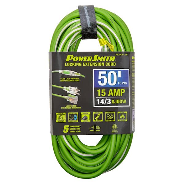 50 ft. 14/3 AWG Rubber Jacket 15 Amp Heavy-Duty Indoor/Outdoor Locking Extension Cord, Green