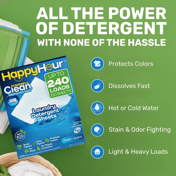 • Happy Hour pre-cut sheets make doing laundry as easy as 1-2-3