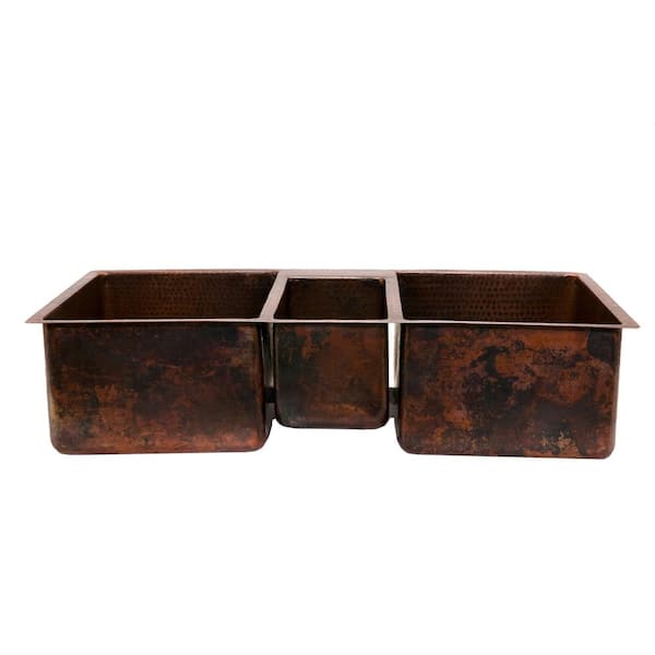 Under Counter/Surface-Mount Hammered Copper 42 in. 0-Hole Triple Bowl Kitchen Sink in Oil Rubbed Bronze