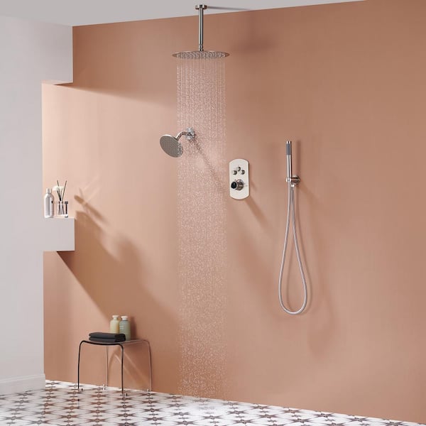 Pressure Balanced 3-Spray Patterns 12 in. Ceiling Mounted Rainfall Dual Shower Heads with Handheld in Brushed Nickel