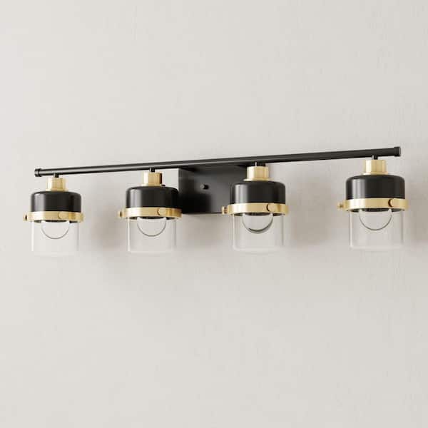 Beckner Collection 33.75 in. 4-Light Matte Black Clear Glass Urban Industrial Vanity Light with Vintage Brass Accents