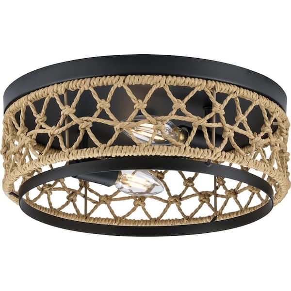 Chandra Collection 12 in. 2-Light Matte Black Flush Mount with Woven Shade