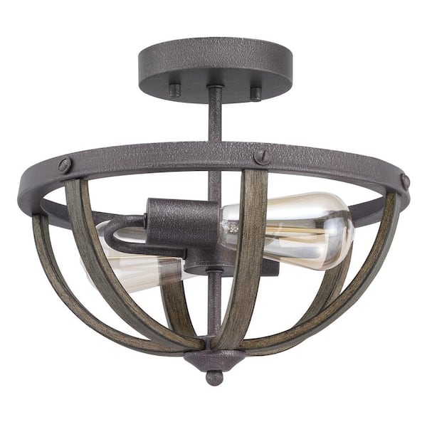 Keowee 13 in. 2-Light Artisan Iron Semi-Flush Mount with Distressed Elm Wood Accents